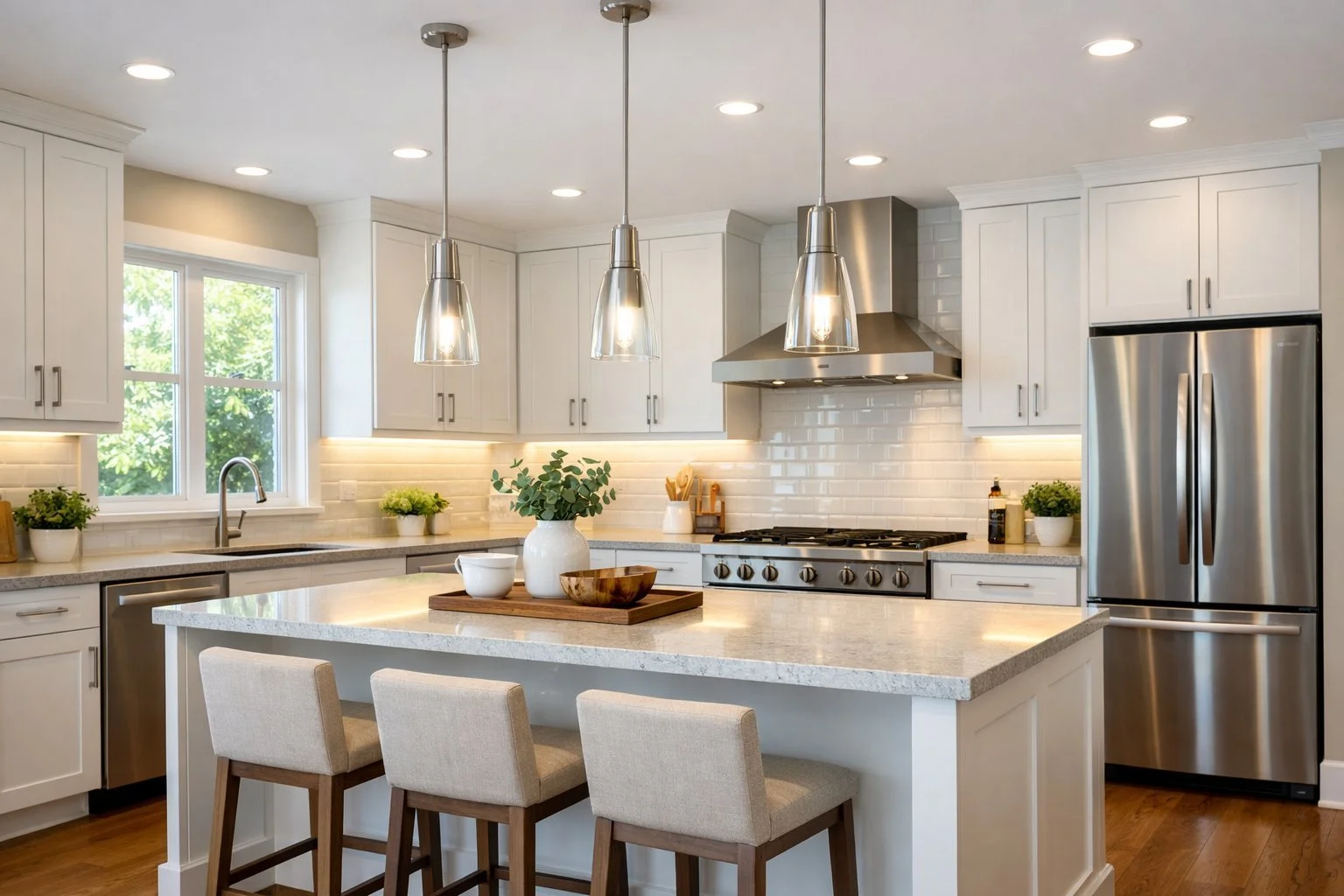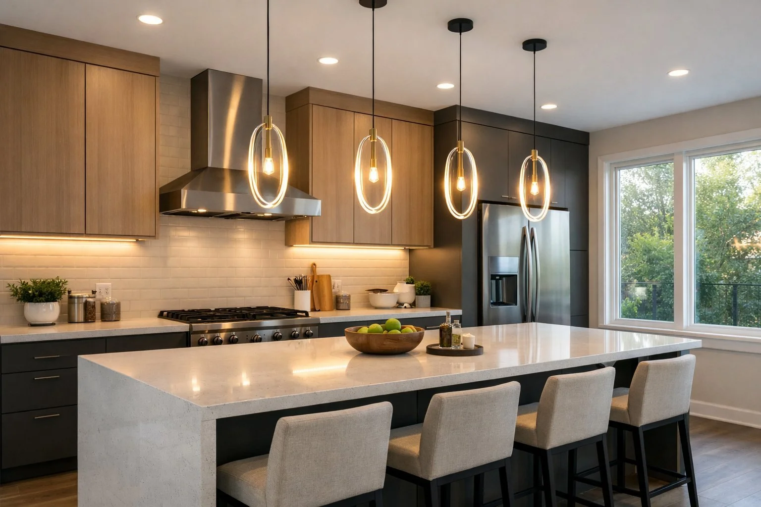 You really need all three layers for a well-lit kitchen. Recessed lights handle the ambient stuff, while pendant lights over the island double as task lighting.